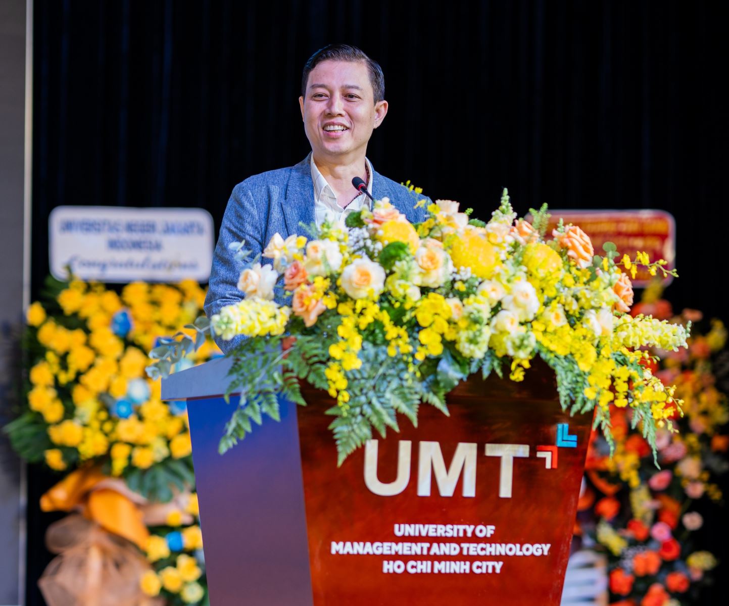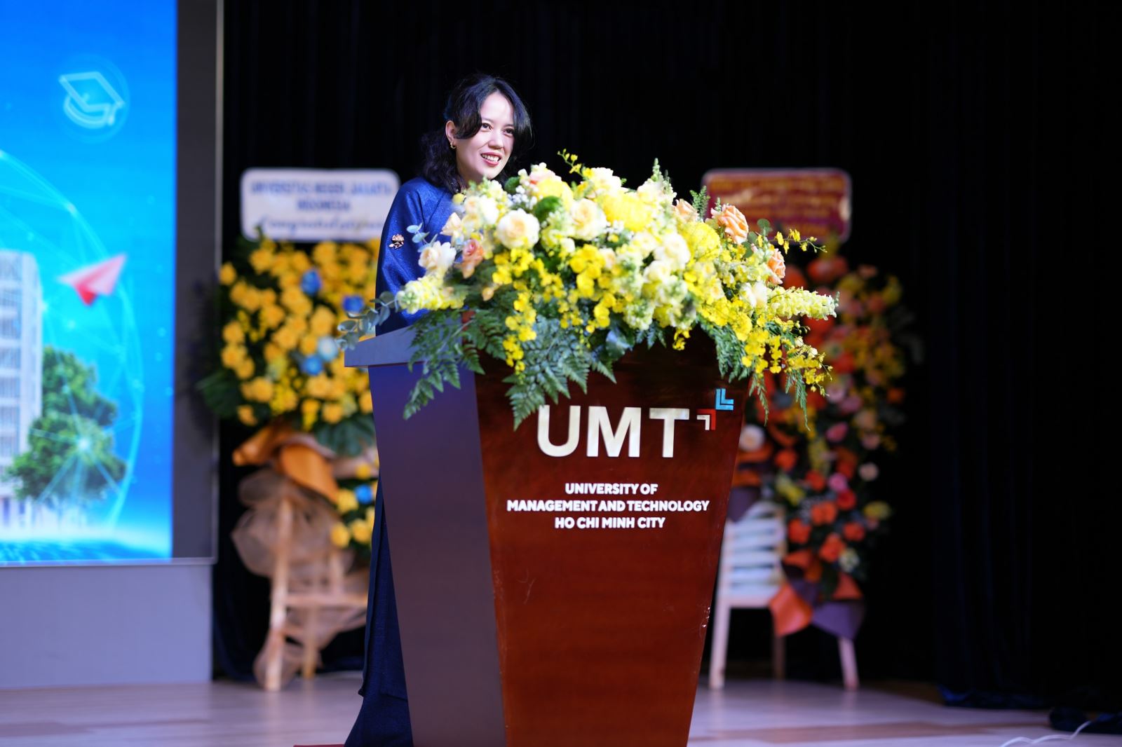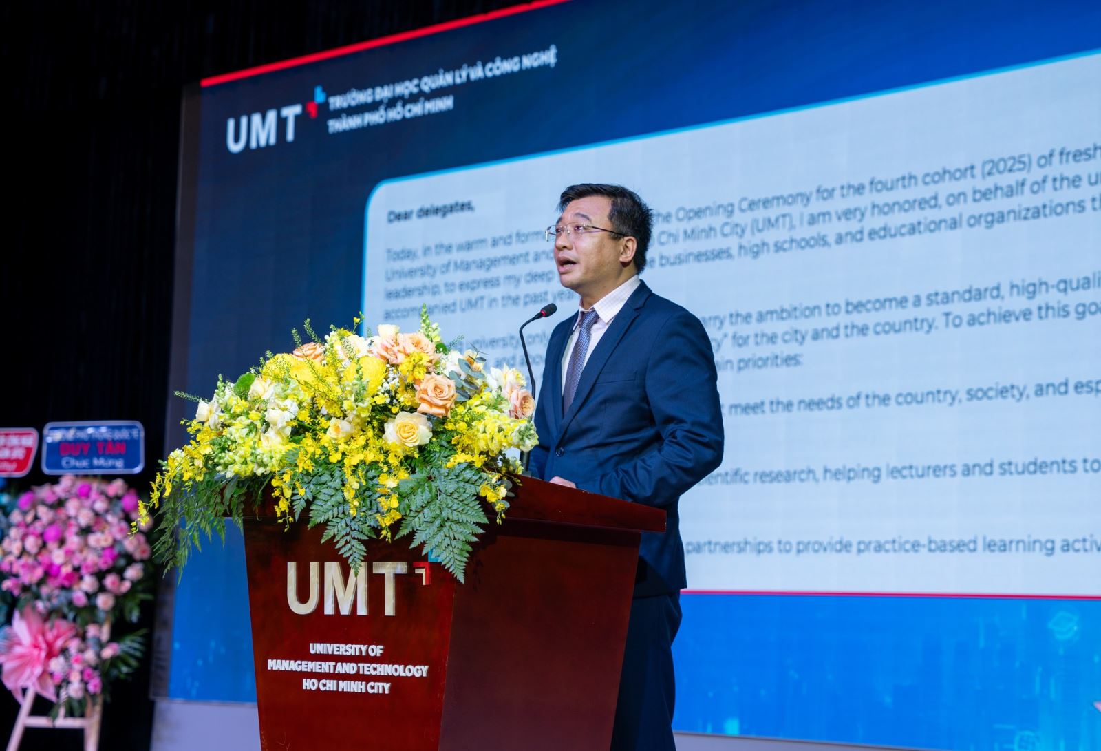 Thay mặt Ban Giám hiệu, ThS. Huỳnh Thúy Phương – Phó Hiệu trưởng UMT, đã phát biểu chào mừng và gửi gắm nhiều kỳ vọng đến tân sinh viên. Cô nhấn mạnh: “UMT là một trường đại học trẻ nhưng kiên định đầu tư vào chương trình đào tạo chất lượng, đội ngũ giảng viên, chuyên gia uy tín, cơ sở vật chất hiện đại và môi trường học tập gắn liền với thực tiễn. Minh chứng rõ nét là những giải thưởng học thuật, nghiên cứu, cùng sự trưởng thành của sinh viên trên các sân chơi trí tuệ trong nước và quốc tế”.